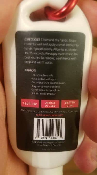 | Drying Time: | Medium — It takes about 15-25 seconds to completely dry. It’s similar to SportmediQ in this way, and also in terms of needing to wait longer than you think for it to fully dry. If you don’t wait long enough, you’ll feel the need to apply more. Or if you grip onto something before the application has completely dried, you’ll lose some of it on the bar/equipment handle, and your grip will be less effective. |